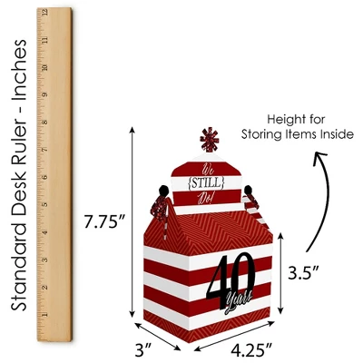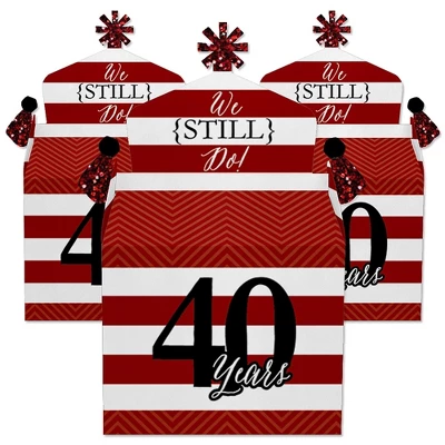Gable Boxes INCLUDE: 12 We Still Do – 40th Wedding Anniversary-themed goodie party favor boxes. Each box SIZE measures 4.25 inches length x 3 inches width x 7.75 inches height. Gable favor boxes are ideal for small gifts and treats that are under 3.5 inches tall (height for storing items in closed box). FUN PARTY FAVORS: Use gable boxes for a unique party gift at any celebration party. This small, closed favor box can be filled with baked goodies, party trinkets, or thank you gifts. Party guests will have fun with the mystery of what each party loot box will contain. PREMIUM PARTY SUPPLY: Gable treat boxes are professionally printed and double-sided on heavy-duty cardstock paper, with a photo-like shine. They are hand-folded, individually inspected, and then carefully packaged. SIMPLE ASSEMBLY: We Still Do – 40th Wedding Anniversary gable boxes will arrive flat. Allow time for the required assembly of each box. Gable boxes have crease lines and numbered tabs for easy folding. Packaging will include assembly instructions. MADE IN THE USA: We Still Do – 40th Wedding Anniversary Party goodie gable boxes are designed and manufactured at our Wisconsin facility using materials that are Made in the USA. 40th Anniversary goodie gable boxes use a No-Mess Glitter Print: Our DIY party decorations are designed with a printed image of glitter, eliminating glitter flake while maximizing bling effect!
