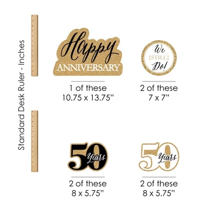 We Still Do – 50th Wedding Anniversary Tabletop Standups INCLUDE: 7 themed stands with 2 bases per stand. Easy assembly is required for this double-side printed stands made from waterproof, sturdy plastic. CENTERPIECE DECORATIONS: We Still Do – 50th Wedding Anniversary tabletop standups add dimension and fun to your gold party decor. Use them to accent your anniversary party candy buffet and then use as home decor after the celebration. We Still Do – 50th Wedding Anniversary tabletop standups are sure to make a statement however you choose to use them! EASY ASSEMBLY: We Still Do – 50th Wedding Anniversary Tabletop Standups assemble quickly by pairing two bases per standup. Create the base by aligning the slot of each base piece with bottom of standup and then slide together. Complete by pressing down to secure pieces. Continue until all seven standups are complete. REUSEABLE PARTY DECORATIONS: Made from sturdy plastic, tabletop standups can be used over and over again with proper care. We Still Do – 50th Wedding Anniversary centerpiece table decorations are professionally printed double-sided on durable, corrugated plastic. Each stand with bases is waterproof and can be used for an outdoor party. MADE IN THE USA: We Still Do – 50th Wedding Anniversary Party Tabletop Standups are professionally printed on sturdy plastic and individually inspected and carefully packaged by hand. Tabletop Standups are designed and manufactured at our Wisconsin facility using materials that are Made in the USA. We Still Do – 50th Wedding Anniversary Tabletop Standups use a No-Mess Glitter Print: Our standups are designed with a printed image of glitter, eliminating glitter flake