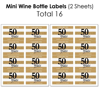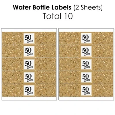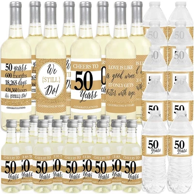 Beverage Bar Kit INCLUDES: 2 sheets mini wine bottle labels (total 16), 2 sheets wine bottle labels (total 8), 2 sheets water bottle labels (total 10). This 34-piece kit is perfect for styling a We Still Do – 50th Wedding Anniversary event. HIGH-QUALITY: Beverage Bar Labels are professionally printed on waterproof adhesive paper with a glossy coating. Mini Wine Bottle Labels SIZE 3.75 inches wide x 2.6 inches tall. Wine Bottle Labels SIZE 4 inches wide x 5 inches tall, fits most standard 750 ml wine bottles. Water Bottle Labels SIZE 8.5 inches wide x 2 inches tall. EASY ASSEMBLY: Prepare your bottles or containers by ensuring they are room temp and dry. For best results, remove original label. First, peel sticker label from sheet and pick one label edge to start. Once the edge is straight, firmly attach and slowly roll the bottle while smoothing the entire label. Beverage Bar Kit Labels are waterproof and can be used on bottles that will be chilled, just be sure to apply prior to chilling. UNIQUE PARTY SUPPLIES: Wow your party guests with a We Still Do – 50th Wedding Anniversary coordinated beverage bar by placing labels on drinks to be served. Just add labels to drinks while dry. We Still Do – 50th Wedding Anniversary Labels can also be used on cylinder containers to create centerpieces. Use decorative labels to create fun and unique party favors or gifts for any wedding anniversary party. MADE IN THE USA: Beverage Bar Kit labels are designed and manufactured at our Wisconsin facility using materials that are Made in the USA. Please Note: Wine and Water in images is not included. We Still Do – 50th Wedding Anniversary labels use a No-Mess Glitter Print: Our beverage labels are designed with a printed image of glitter, eliminating glitter flake while maximizing bling effect!