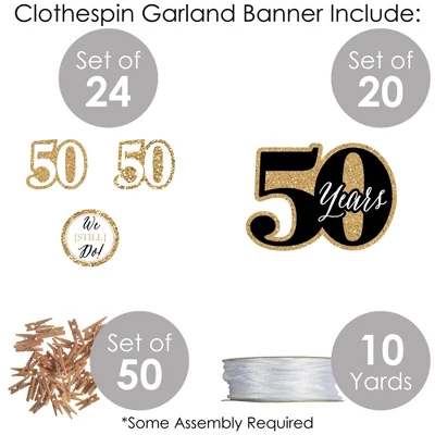 Clothespin Garland Banner – 44 Pieces INCLUDE: 24 small shaped cut-outs, 20 large shaped cut-outs, 50 mini clothespins, and 10 yards white 2mm satin cord. Some simple assembly required. DIY PARTY SUPPLIES: We Still Do – 50th Wedding Anniversary small paper shaped cut-out SIZE 16 50 (2.5 inches x 2 inches), 8 We Still Do! (2.25 inches x 2.25 inches). We Still Do – 50th Wedding Anniversary large paper shaped cut-outs SIZE 20 50 (7 inches x 5 inches). EASY PARTY DECOR: Style any anniversary party with We Still Do – 50th Wedding Anniversary clothespin garland banner. Before hanging, plan out your desired pattern by alternating in sizes. Using a miniature clothespin, clip shapes on the included cord. Hang finished DIY garland banner at the entrance of your party, over mantelpiece, along buffet tables as banner decoration. After the party, reuse the clothespins and cord to hang event photos as a fun keepsake. PREMIUM PARTY DECORATION: We Still Do – 50th Wedding Anniversary large cut-outs are professionally printed double-sided. Small cut-outs are professionally printed with coordinating pattern on back, and all on sturdy cardstock paper with a photo-like shine. They are then individually cut, inspected and carefully packaged. We Still Do – 50th Wedding Anniversary clothespin garland banner is a 44-piece DIY kit that can be used in many ways. MADE IN THE USA: We Still Do – 50th Wedding Anniversary clothespin garland banner decoration kit is designed and manufactured at our Wisconsin facility using materials that are Made in the USA. We Still Do – 50th Wedding Anniversary DIY garland banner use a No-Mess Glitter Print: Our DIY party decorations are designed with a printed image of glitter, eliminating glitter flake while maximizing bling effect!