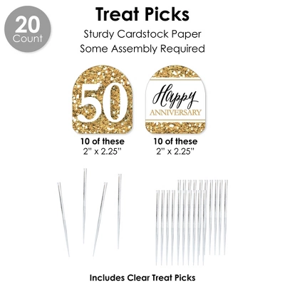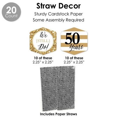 DIY WRAPPERS includes: 20 total reversible wrappers that are 10.75″ wide x 2″ tall. When wrapped, they can accommodate favors 1.75″ to 2.5″ in diameter. These wrappers for a Anniversary Party are easy to secure on a variety of items! CUPCAKE WRAPPERS includes: 20 adjustable cupcake wrappers 1.75″ – 2.5″ wide x 1.75″ tall. We Still Do – 50th Wedding Anniversary cupcake wrappers will fit over cupcake liners on standard and medium-sized cupcakes and are reversible for a coordinated look. Secure cupcake wrappers by sliding the tab into appropriate slit. TREAT PICKS includes: 20 cut-outs 2″ wide x 2.25″ tall & clear treat picks 4″ tall. 50th Anniversary Themed paper cut-outs come in 2 designs. Assembly stickers are included for easy DIY required assembly. FAVOR GIFT TAGS includes: 20 gift tags 3.5″ wide by 2.75″ tall & satin ribbon. Write a message on the back side of We Still Do – 50th Wedding Anniversary gift tags for a personal touch then attach to favors with ribbon. STRAW DECOR includes 20 cut-outs with 2 designs10 of each, size 2.25″ wide by 2.25″ tall and chevron striped paper straws – 7.75″ tall. Shaped cut-outs are professionally printed on sturdy cardstock paper. For easy assembly, create your stylish drinks by attaching 50th Anniversary Themed shaped cut-outs to paper straws with clear stickers included. Favor party pack is designed and manufactured at our Wisconsin facility using materials that are Made in the USA. We Still Do – 50th Wedding Anniversary favor pack uses a No-Mess Glitter Print: Our party kits are designed with a printed image of glitter, eliminating glitter flake while maximizing bling effect!