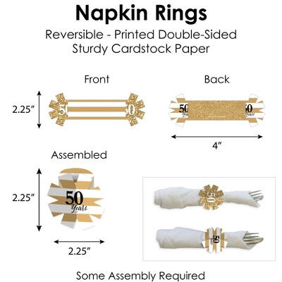 - Napkin Rings: Includes 8 reversible DIY paper rings that measure 2.25” wide by 2.25” tall when assembled. Design Reads: “50 Year”