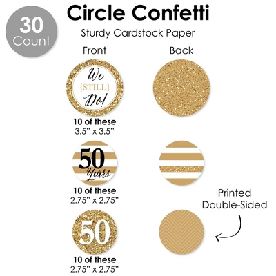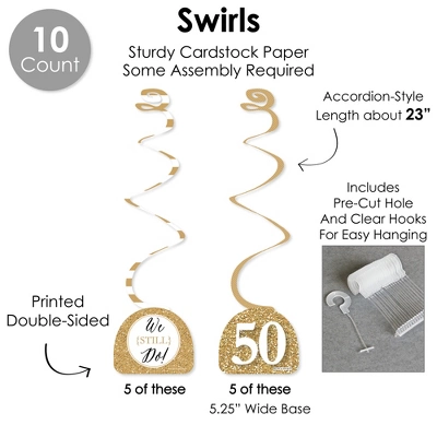 SWIRLS includes: 10 total swirls with 2 designs – 5 count per design, that hang with an accordion-style spiral. Professionally printed double-sided, the We Still Do – 50th Wedding Anniversary decoration swirls come with a 5.25” wide base and a spiral length of about 23” long. Each decoration swirl comes with a pre-cut hole and clear hooks for easy assembly. BUNTING BANNER includes: letter and themed pennants, perfect for your 50th Wedding Anniversary Anniversary Party. Each pennant measures 5” wide x 7.25” tall. Pennants are numbered in sequence and ribbon is included for easy assembly. TABLE TOPPERS includes: 10 centerpiece sticks that come with two shape cut-out designs, each professionally printed double-sided. The centerpiece shapes measure 7.5” wide x 5” tall. To use as centerpieces or photo props for your Anniversary Party, assembly stickers are included for the easy DIY required assembly. CIRCLE CONFETTI includes: 30 paper circles with 2 different sizes -10 large circles, size 3.5” and 20 small circles, size 2.75”. Professionally printed double-sided, the We Still Do – 50th Wedding Anniversary circle confetti can be placed flipped over for added variety. Scatter around your table for a delightful accent. MADE IN THE USA: We Still Do – 50th Wedding Anniversary Decor Galore Party Pack is designed and manufactured at our Wisconsin facility using materials that are Made in the USA. We Still Do – 50th Wedding Anniversary Decor Galore Party Pack uses a No-Mess Glitter Print: Our Party Pack is designed with a printed image of glitter, eliminating glitter flake while maximizing bling effect!