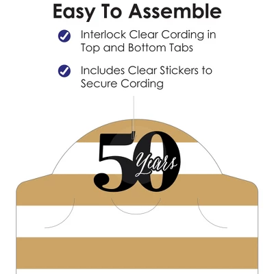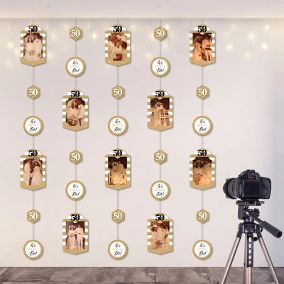 Big Dot of Happiness We Still Do – 50th Wedding Anniversary Hanging Vertical Photo Garland includes 35 shaped pieces, 1 roll of clear cording, and assembly stickers that you can use to transform your Anniversary Party into an unforgettable celebration. With the 10 double-sided photo frames, insert 4 x 6 portrait photos of your guest of honor into the front and back sides. You can display up to 20 pictures using the multiple tabs to secure them into place, allowing your photo garland to look great from all angles. Delightful Decor: We Still Do – 50th Wedding Anniversary Vertical Garland can be displayed at any length you choose for a dynamic look at your celebration. You can create a backdrop, hang it from the ceiling, or attach it above your dessert table—the possibilities are endless. DIY Assembly: Start by placing your 4 x 6 portrait pictures on the front and back sides of the photo frame cut-out pieces. Then, plan your display by laying the cut-out pieces on a flat surface. Interlock the clear cording into each cut-out piece and secure it with the provided clear stickers. Instructions are also included on the packaging. High-Quality Supply: We Still Do – 50th Wedding Anniversary vertical hanging garland pieces are professionally printed double-sided on heavy-duty cardstock paper. Photo frames measure 5.5 inches wide x 9.25 inches tall. Circle pieces measure 4.25 inches in diameter. Hexagon cut-outs measure 3 inches wide by 3.25 inches tall. Made In The USA: We Still Do – 50th Wedding Anniversary Photo Vertical Garlands are designed and manufactured at our Wisconsin facility using materials that are Made in the USA. We Still Do – 50th Wedding Anniversary Garland Cut-Outs use a No-Mess Glitter Print: Our garland cut-outs are designed with a printed image of glitter, eliminating glitter flake while maximizing bling effect!