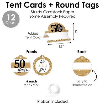 Sign with Stand includes 1 We Still Do – 50th Wedding Anniversary sign with a built-in stand that you can place at your Snack bar. Sign measures 7.5 inches wide by 11 inches tall and requires some easy DIY assembly. To display, fold the sides of the stand towards the center and then fold down the support piece of the stand until it rests in the notches. Bunting Banner includes letters and themed pennants that measure 5 inches wide x 7.25 inches tall. Easily make a statement with this decorative banner at your Anniversary Party. Pennants spell out “Love Is Sweet” and come in a numbered sequence with ribbon included for easy assembly. Tent Cards includes 12 place cards that measure 3 inches wide by 3.5 inches tall when assembled. To use, push back the top outer edge, revealing the half-circle top. Fold along the pre-scored line in the center to create the tent shape, and then add your own wording for display! Straw Decor Flags includes 12 flag pennant cut-outs, size 2.25 inches wide by 1.5 inches tall when folded, and chevron paper straws – 7.75 inches tall. To assemble, place the included adhesive dot to the inside of the flag and then attach the straw! Tags and Cut-outs includes 12 round tags and 12 hexagonal cut-outs. They measure 2.25 inches wide x 2.25 inches tall. Round tags come with playful We Still Do – 50th Wedding Anniversary phrases and include coordinating pre-cut ribbon for easy DIY favor decorations. Cut-outs are reversible and make for the perfect table decor accents. We Still Do – 50th Wedding Anniversary Bar Decorations Kit uses a No-Mess Glitter Print: Our decoration kit is designed with a printed image of glitter, eliminating glitter flake while maximizing bling effect!