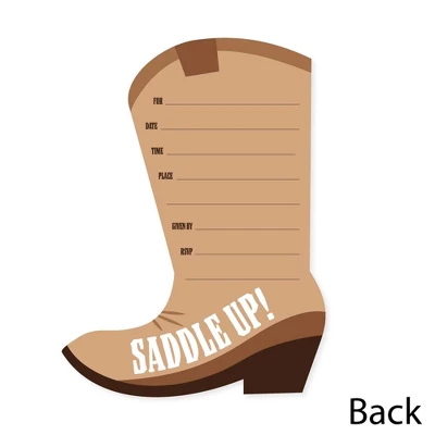 Western Hoedown Fill-In the Blank Invitation Set INCLUDES 12 cowboy boots invitations and 12 premium white envelopes. Western Hoedown fill-in invitations are perfect for any event. The country theme is great for a Wild West Cowboy party. Cowboy boots party invitations SIZE 5 inches by 7 inches. The included envelopes measure 5 inches by 7 inches. The back of each Western Hoedown invitation has space to add your party details: For: Date: Time: Place: Given By: RSVP: PREMIUM PARTY INVITATIONS: Cowboy boots party invitations are professionally printed on heavy-duty cardstock paper with a photo-like shine. They are individually inspected, then carefully packaged with our exclusive squiggle flap envelopes, making this Western Hoedown stationary set a must-have for any Wild West Cowboy party. MADE IN THE USA: Western Hoedown – Wild West Cowboy Party Invitations are designed and manufactured at our Wisconsin facility using materials that are Made in the USA.
