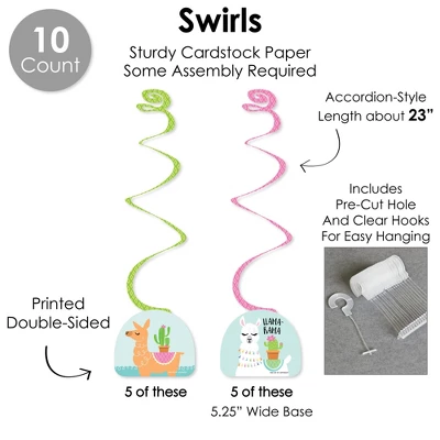 SWIRLS includes: 10 total swirls with 2 designs – 5 count per design, that hang with an accordion-style spiral. Professionally printed double-sided, the Whole Llama Fun decoration swirls come with a 5.25” wide base and a spiral length of about 23” long. Each decoration swirl comes with a pre-cut hole and clear hooks for easy assembly. BUNTING BANNER includes: letter and themed pennants, perfect for your Llama Fiesta Themed Baby Shower or Birthday Party. Each pennant measures 5” wide x 7.25” tall. Pennants are numbered in sequence and ribbon is included for easy assembly. TABLE TOPPERS includes: 10 centerpiece sticks that come with two shape cut-out designs, each professionally printed double-sided. The centerpiece shapes measure 7.5” wide x 5” tall. To use as centerpieces or photo props for your Baby Shower or Birthday Party, assembly stickers are included for the easy DIY required assembly. CIRCLE CONFETTI includes: 30 paper circles with 2 different sizes – 10 large circles, size 3.5” and 20 small circles, size 2.75”. Professionally printed double-sided, the Whole Llama Fun circle confetti can be placed flipped over for added variety. Scatter around your table for a delightful accent. MADE IN THE USA: Whole Llama Fun Decor Galore Party Pack is designed and manufactured at our Wisconsin facility using materials that are Made in the USA.