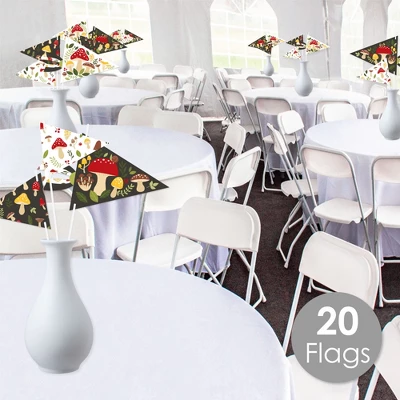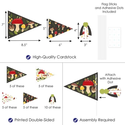 Big Dot of Happiness Wild Mushrooms Pennant Flag Centerpieces include a set of 20 paper triangle flags, 10 paper tassel shapes, paper sticks, and adhesive dots. Pennant centerpieces will help create an impressive look at your Red Toadstool Party. Party Decor: Make a statement with the Forest table decorations at your celebration. Insert them into vases or floral arrangements and place them at the center of your tablescape. They are the perfect way to accent your tables and are also a great addition to any photo booth. Easy DIY: Wild Mushrooms flag decorations come with sticks and adhesive dots for easy assembly. Simply insert a stick into the holes on the side of a pennant triangle and attach a paper tassel with an included adhesive dot. Then, begin arranging your centerpiece decorations! High-Quality Supply: Wild Mushrooms flags are professionally printed double-sided on heavy-duty cardstock paper with a photo-like shine. Large pennants measure 8.5 inches wide by 7 inches tall, small pennants measure 6 inches wide by 5 inches tall, and paper tassels measure 3 inches wide by 4 inches tall. Assembled In The USA: Wild Mushrooms Pennant Flag Centerpieces are designed and manufactured at our Wisconsin facility using materials that are Made in the USA – Sticks Made in China.