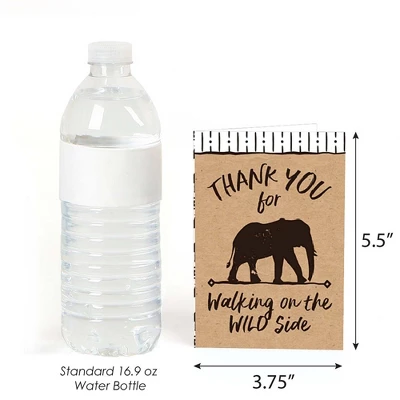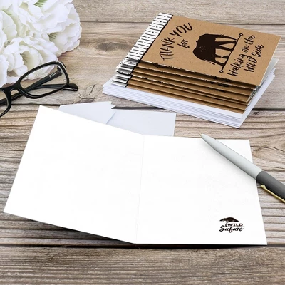 Wild Safari Thank You Note Card Set INCLUDES 8 jungle safari party thank yous and premium white envelopes. Wild Safari thank you notes are perfect for any event. The safari theme is great for a baby shower or birthday party. Wild Safari note cards SIZE 5.5 inches by 3.75 inches, folded. The included envelopes measure 5.75 inches by 3.75 inches. The inside of each Wild Safari thank you card stationery has a fun graphic as well as space to write a special note to friends and family. PREMIUM THANK YOU CARDS: Wild Safari thank you cards are professionally printed on heavy-duty card stock paper with a photo-like shine. They are hand-folded and individually inspected, then carefully packaged with our exclusive squiggle flap envelopes, making this safari animals stationary set a must-have for baby shower or birthday parties. MADE IN THE USA: Wild Safari – Party Thank You Cards are designed and manufactured at our Wisconsin facility using materials that are Made in the USA.