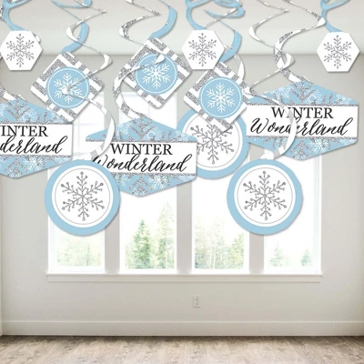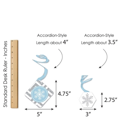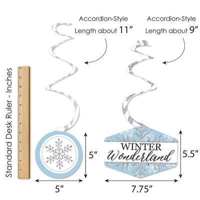 Party Decoration Swirls – Set of 40 INCLUDES 4 different shapes, 10 count per shape, that hang below an accordion-style spiral with included clear hooks. 10 swirls SIZE 5 inches x 5 inches with length about 11 inches. 10 swirls, SIZE 7.75 inches x 5.5 inches with length about 9 inches. 10 swirls, SIZE 5 inches x 4.75 inches with length about 4 inches. 10 swirls, SIZE 3 inches x 2.75 inches with length about 3.5 inches. PERFECT FOR ANY EVENT: With different hanging lengths and a variety of shapes and sizes, Party Decoration Swirls are perfect for holiday or winter wedding event. Add a pop of color when displayed over the gift table or dessert buffet. Or, add your own string if you would like them to hang lower in your party space. EASY TO USE: Each decoration swirl in the 40-piece set has a pre-cut hole for easy assembly using the included clear hooks. Party decoration swirls will arrive flat. Take a clear hook and insert the bottom bar into the pre-cut hole. Once the clear hook is fastened, gently stretch the swirl and hang it up. HIGH-QUALITY PARTY SUPPLY: Winter Wonderland Party Decoration Swirls are professionally printed and double-sided on heavy-duty cardstock paper. They are individually cut, inspected, and carefully packaged. Each swirl will use one clear hook. MADE IN THE USA: Party Decoration Swirls are designed and manufactured at our Wisconsin facility using materials that are Made in the USA. Winter Wonderland Party Decoration Swirls uses a No-Mess Glitter Print: Our party kits are designed with a printed image of glitter, eliminating glitter flake while maximizing bling effect!