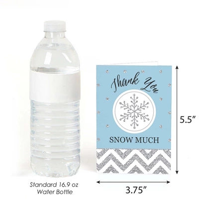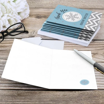 Winter Wonderland Thank You Note Card Set INCLUDES 8 snowflake party thank yous and premium white envelopes. Winter Wonderland thank you notes are perfect for a Snowflake Holiday Party & Winter Wedding of any age. Winter Wonderland Snowflake Holiday Party & Winter Wedding note cards SIZE 5.5 inches by 3.75 inches, folded. The included envelopes measure 5.75 inches by 3.75 inches. The inside of each Winter Wonderland thank you card stationery has a fun graphic as well as space to write a special note to friends and family. PREMIUM THANK YOU CARDS: Winter Wonderland Snowflake Holiday Party & Winter Wedding thank you cards are professionally printed on heavy-duty cardstock paper with a photo-like shine. They are then hand-folded and individually inspected, then carefully packaged with our exclusive squiggle flap envelopes, making this snowflake stationary set a must-have for any wedding, bridal shower, baby shower or birthday party. MADE IN THE USA: Winter Wonderland – Snowflake Holiday Party & Winter Wedding Thank You Cards are designed and manufactured at our Wisconsin facility using materials that are Made in the USA. Winter Wonderland thank you cards use a No-Mess Glitter Print: Our thank you cards are designed with a printed image of glitter, eliminating glitter flake while maximizing bling effect!