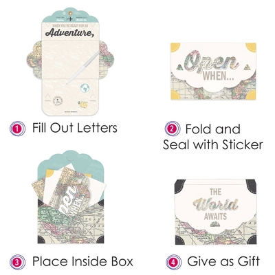 Big Dot of Happiness World Awaits Open When Letters includes a set of 8 letters with a DIY gift box. Seven letters come with pre-marked prompts and 1 letter comes blank for you to write your own special message. These letters make for a heartwarming gift at a Going Away Party. Heartfelt Surprise: From funny stories to words of encouragement, the World Awaits messages are the perfect way to stay connected with your recipient. You can share memories, offer advice, and enclose special items like photographs or gift cards. Easy Assembly: After writing your messages, transform your letter into an envelope shape by folding the sides inward. Next, fold and attach the bottom flap by inserting the tabs into the slots of the side flaps. Finally, fold the top flap over and insert its tabs into the slots. Seal your envelope shut using an included clear sticker. Use the included instruction card for practice. High-Quality Supply: World Awaits Open When Letters are professionally printed double-sided on heavy-duty cardstock paper. When folded, letter cards measure 6.25 inches wide x 4.25 inches tall, and when open, cards measure 9.5 inches wide x 11.75 inches tall. Made In The USA: World Awaits Open When Letters are designed and manufactured at our Wisconsin facility using materials that are Made in the USA.