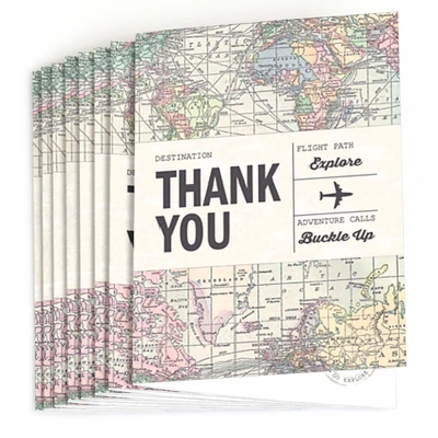 World Awaits Thank You Note Card Set INCLUDES 8 travel party thank yous and premium white envelopes. World Awaits thank you notes are perfect for any event. The map theme is great for a baby, bridal shower, retirement, birthday or graduation party. World Awaits party note cards SIZE 5.5 inches by 3.75 inches, folded. The included envelopes measure 5.75 inches by 3.75 inches. The inside of each World Awaits thank you card stationery has a fun graphic as well as space to write a special note to friends and family. PREMIUM THANK YOU CARDS: World Awaits party thank you cards are professionally printed on heavy-duty cardstock paper with a photo-like shine. They are hand-folded and individually inspected, then carefully packaged with our exclusive squiggle flap envelopes, making this travel stationary set a must-have for baby, bridal showers, retirement, birthday or graduation parties. MADE IN THE USA: World Awaits – Baby, Bridal Shower, Retirement, Birthday or Graduation Party Thank You Cards are designed and manufactured at our Wisconsin facility using materials that are Made in the USA.